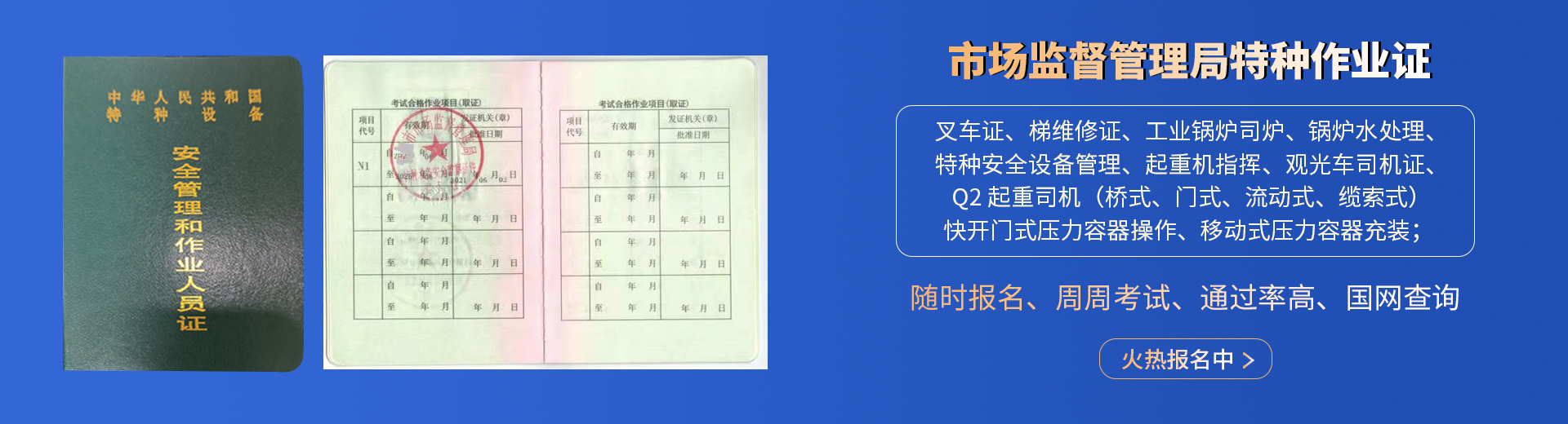 叉車證,電梯維修證,起重司機(jī)-橋式-門式-流動式,起重指揮,壓力容器操作,鍋爐司爐,水處理,特種設(shè)備管理,觀光車;